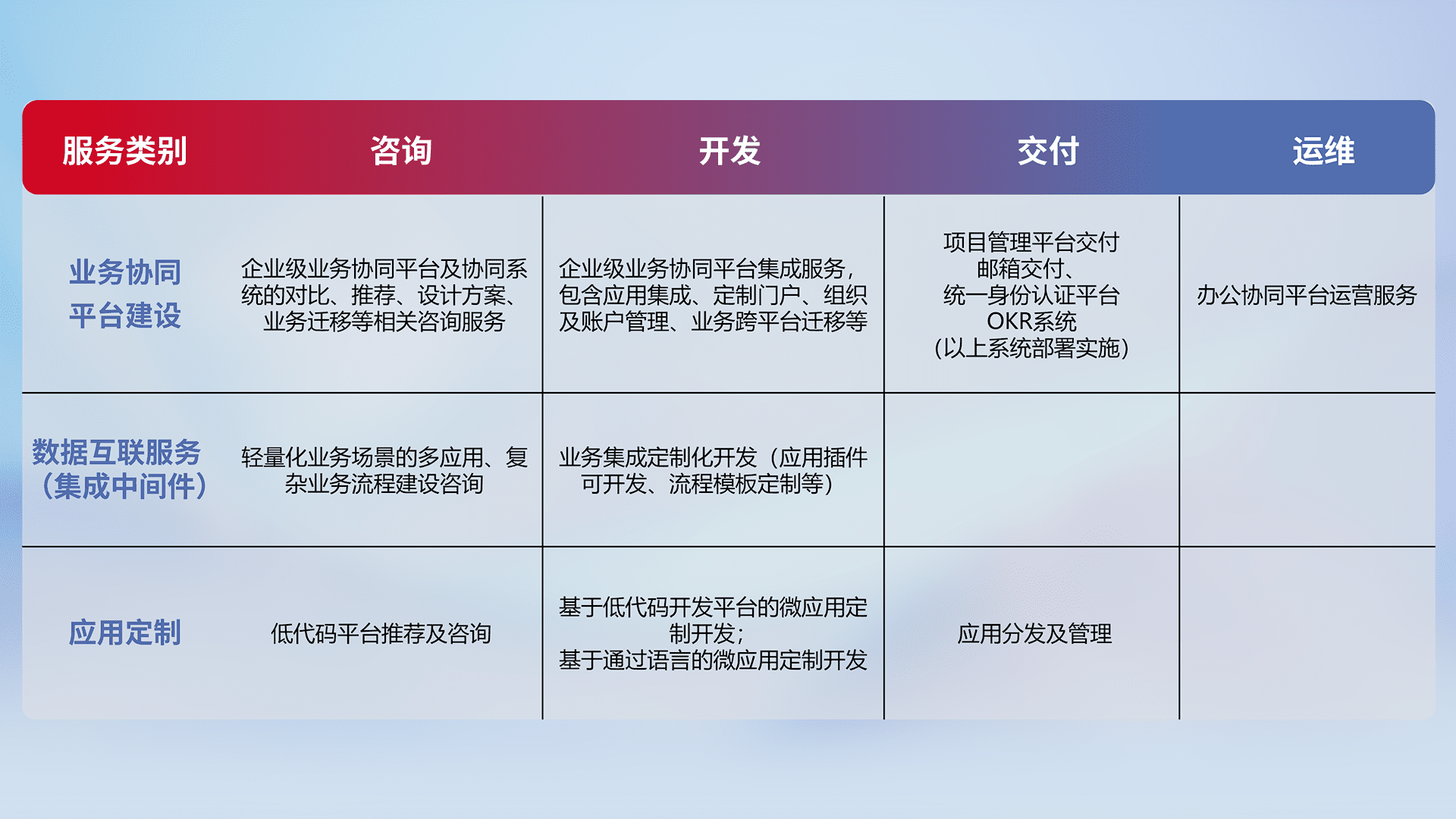 针对钉钉、、、企微、、、IDaas等平台级产品提供产品的规划、、、、方案、、交付、、、定制化开发等服务,,,,实现如统一协同办公、、智能客户服务、、混合会议管理、、、、智能数据查询、、、、等业务场景,,实现数字化转型。。。。